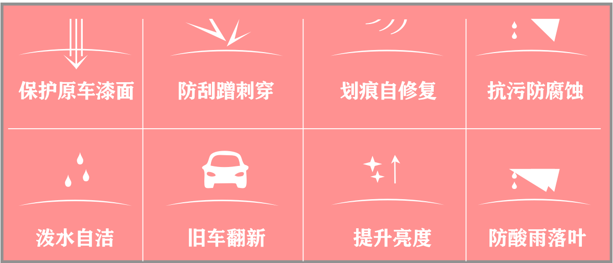 进口基材的一种薄膜材料,表面加持双层纳米涂层,基材稳定,耐侯性极加,可以在温度-40℃~120℃长时间作业而不黄变,独特致密涂层技术,防渗透防水斑防污渍,带划痕修复功能,增亮效果达原车漆50%以上。